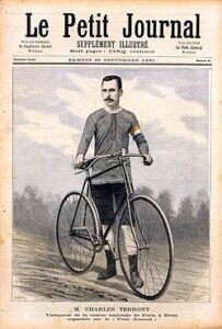 Paris-Brest-Paris 1891, départ devant le siège du Petit Journal. Charles Terront, premier vainqueur de la course en 1891. Le vélo de Charles Terront équipé de pneus michelin démontables, exposé à L’Aventure Michelin à Clermont-Ferrand.En 1891, le Petit Journal de Paris dirigé par Hippolyte Marinoni organise le premier Paris-Brest-Paris. Pierre Giffard, directeur de l’information du journal, souhaite démontrer le caractère pratique de la bicyclette par une course de 1 200 km. Les bicyclettes ont été plombées avant la course pour contrôler l’utilisation d’une seule et même machine par les participants. Les étrangers et les femmes n’étaient pas autorisés à participer à cette épreuve. C’est un vrai succès au regard des plus de 400 inscriptions. Deux cent six cyclistes s’élancent le 6 septembre, y compris dix tricycles, deux tandems et un grand-bi monté par M. Duval. | ![]() |